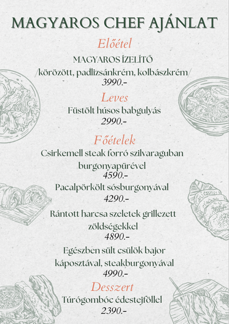 Éttermünk változatos és kifinomult menüjével kényezteti vendégeinket. A séfek gondosan összeállított étlapunkon megtalálhatók a friss, szezonális alapanyagokból készült ínycsiklandó fogások. Az ételkínálatunk széles skáláján minden ízlésnek és étkezési preferenciának megfelelő választékot kínálunk, hogy mindenki megtalálhassa a számára tökéletes ételélményt éttermünkben.
